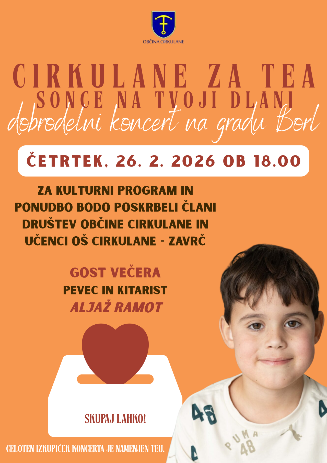 V Občini Cirkulane verjamemo, da lahko z majhnimi dejanji ustvarimo velike spremembe. Zato vas toplo vabimo na dobrodelni koncert »Cirkulane za Tea – Sonce na tvoj dlani«, ki bo potekal v čarobnem ambientu gradu Borl. Večer bo namenjen povezovanju ljudi, srčnosti in pomoči tistemu, ki jo v tem trenutku najbolj potrebuje.