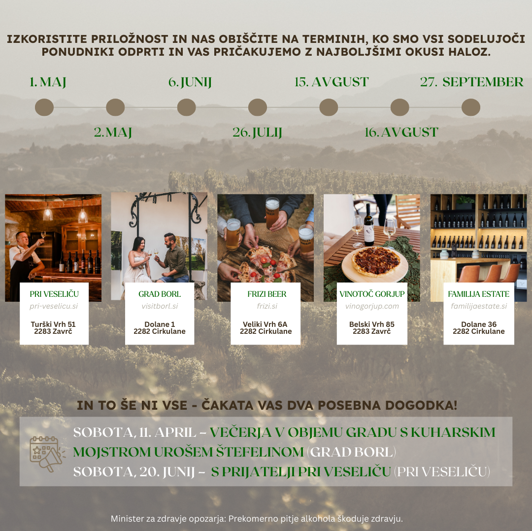 Kulinarična avantura Haloze je projekt, ki združuje ljubitelje dobre hrane, kakovostnih pijač in avtentičnih doživetij. Preko projekta odpiramo vrata petih izbranih ponudnikov – Pri Veseliču, Grad Borl, Frizi Beer, Vinotoč Gorjup in Familija Estate – ki vas bodo razvajali s svojimi specialitetami ter vas popeljali skozi zgodbo vina, piva in kulinarike tega čarobnega območja.