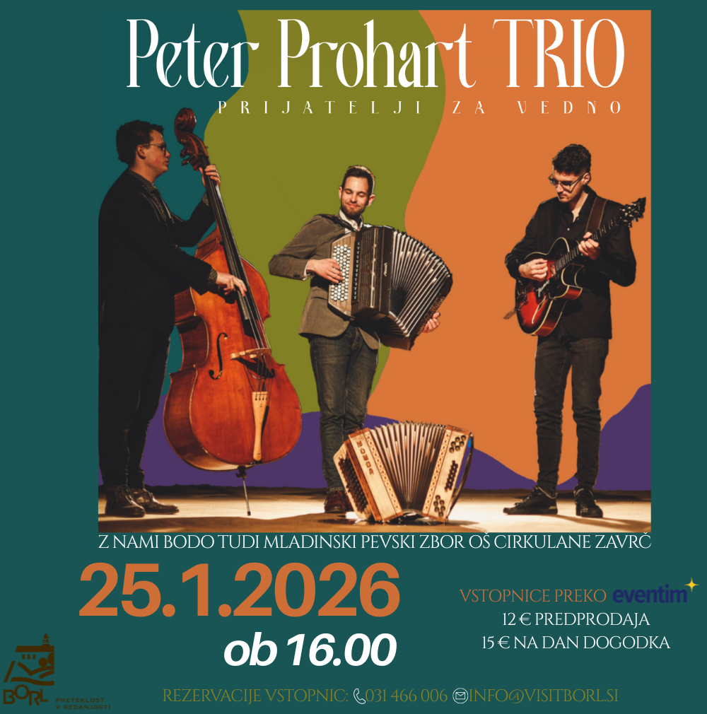 Peter Prohart Trio združuje vrhunske glasbenike, ki z iskreno ljubeznijo do slovenske narodnozabavne glasbe ustvarjajo toplino, domačnost in pravo praznično vzdušje. Njihove melodije bodo v na začetku leta 2026 zazvenele v edinstvenem ambientu viteške dvorane gradu Borl ter večeru vdihnile poseben čar in občutek povezanosti tradicije, glasbe in grajskega prostora.
